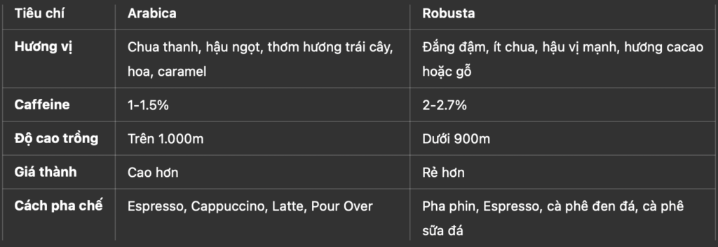 ✅ Bạn thích cà phê đậm đà, đắng rõ, giúp tỉnh táo nhanh? → Chọn Robusta.